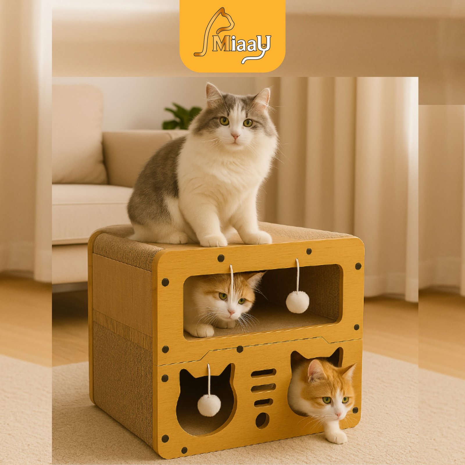 Fabricada en cartón corrugado de alta resistencia y madera reforzada, esta casa rascador soporta el uso constante, permitiendo que tu gato afile sus uñas de forma segura mientras protege tus muebles. Incluye áreas tipo cueva, plataformas superiores para observar su entorno y juguetes colgantes que estimulan el juego activo.