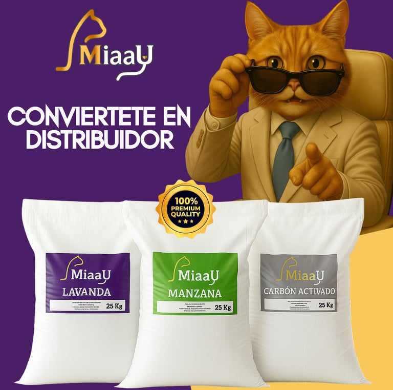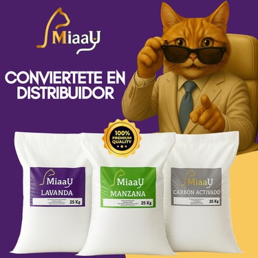 Con presentaciones de 25 kg y aromas como Carbón Activado, Manzana y Lavanda, MIAUU se ha convertido en una de las arenas preferidas por tiendas, veterinarias y mayoristas en Colombia.